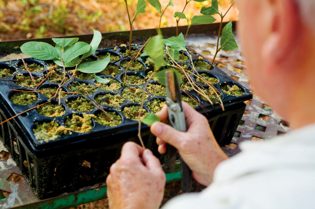 Julian Adams takes cuttings of Stewartia at the western entrance of the garden.