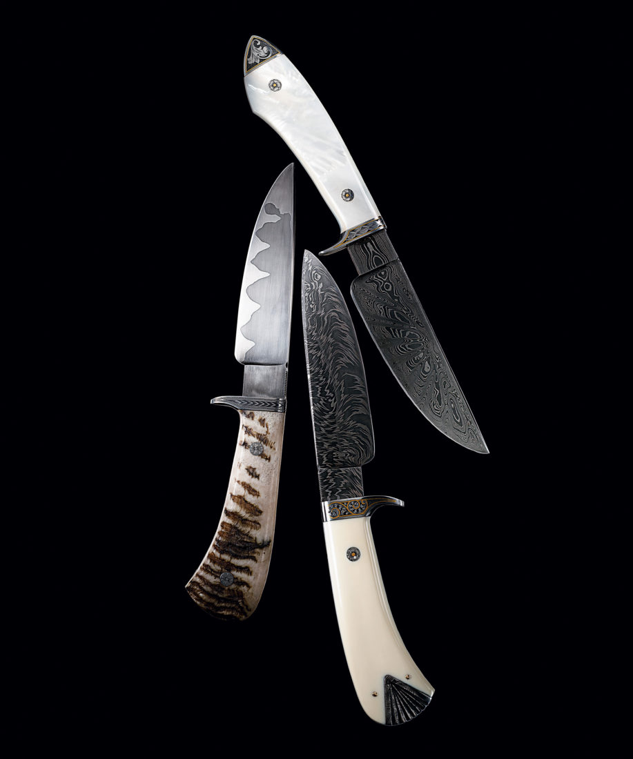The native Arkansan — designated in 1999 a National Living Treasure — merges the disciplines of metallurgy, lapidary, and woodworking to handcraft knives treasured by collectors for their incomparable beauty and utility. His blades can literally split a hair. The scrolled engravings are so logical and natural that they seem to be an innate part of the source metal, drawn out in the forging process. His decorative handles are made from the finest wood or mammoth ivory, inlaid with mother-of-pearl, silver, or gold.