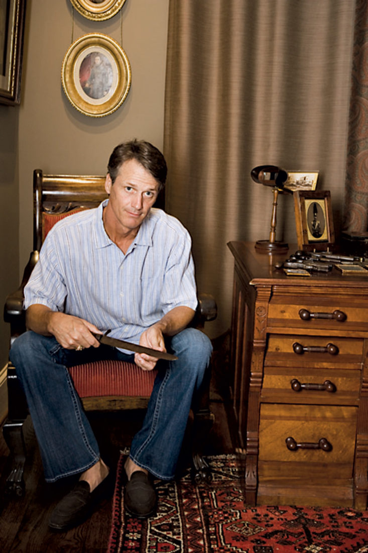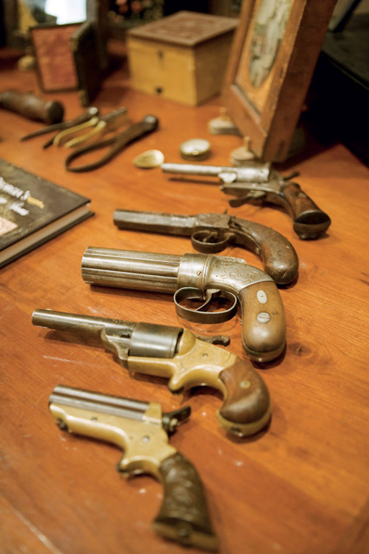 And it’s a trip Vaughan is constantly ready to take. He considers a two-man portrait of the Hawkins brothers, from Oglethorpe, Georgia, who were attached to the 38th Georgia Infantry. The brother on the left—the lieutenant with bushy sideburns who is drawing his sword in the photo—was killed at the Battle of Winchester. The other brother, pulling his knife, survived the war. And then there is the tinted ambrotype of James M. Stedham, from Company F, 25th Alabama Infantry Regiment, Army of Tennessee. Decked out in a slouch hat and an eight-button tunic, he carries a rifle, a bowie knife, and a single-shot boot pistol. Captured at Resaca, Georgia, on May 15, 1864, he died of “acute dysentery” at a prison camp in Indiana the following year.