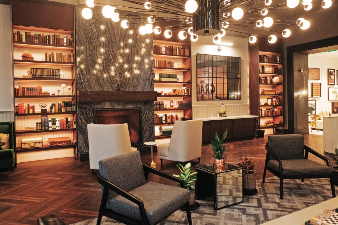 Opened in 2021, the Grady Hotel sits in an 1880s building on West Main Street that was once home to a medicinal bourbon apothecary and a milliner of fine Derby hats. Today the property sports a refined aesthetic with soaring ceilings paneled in reclaimed wood, and a speakeasy-style bar and restaurant in the catacombs beneath.