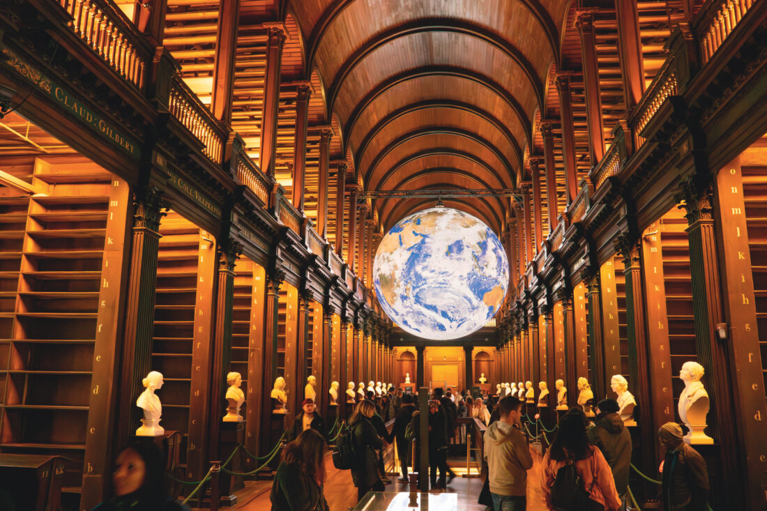 Gaia, a touring artwork by Luke Jerram, at the Trinity College Old Library.