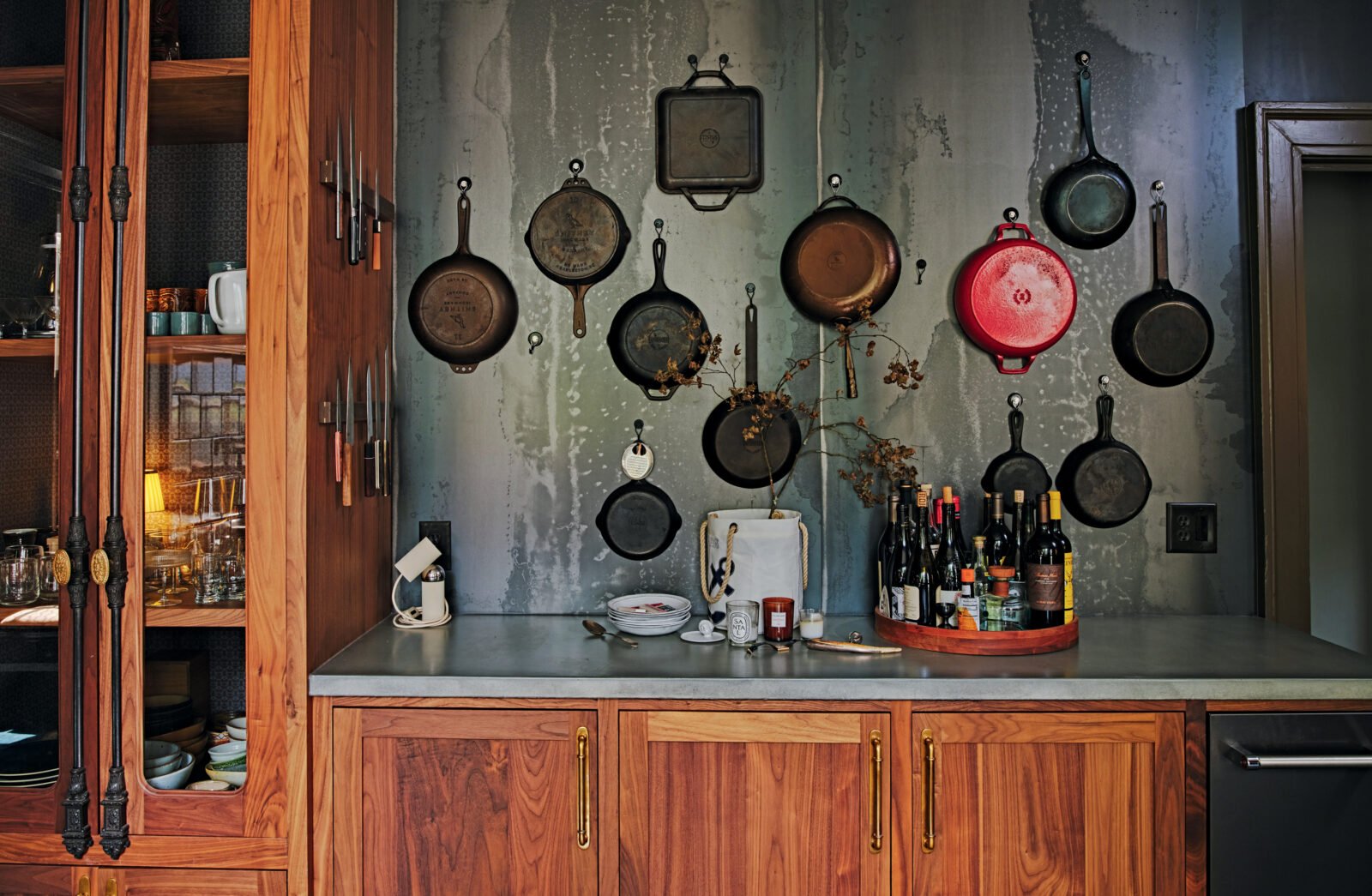 Despite his career as a professional chef, Alton Brown despises the ubiquitous dream kitchen with a big island and stainless-steel appliances. “It’s a metal that, to my mind, exists only to be cleaned,” he says. So in 2023 when he and his wife, the restaurant designer Elizabeth Ingram, took over her parents’ 1920s English country–style house in Atlanta, they gutted the 1980s kitchen and reimagined it as a furnished room that they happen to cook and eat in. “We love rich material—walnut, concrete, brass, and terra-cotta tile,” Brown says. “It’s the kind of kitchen Jules Verne might have had, built around a well-worn eighteenth-century French farmhouse table, which is the center of the kitchen and, honestly, the house.” While Ingram, whose portfolio includes Marcel in Atlanta and Chubby Fish in Charleston, South Carolina, led the charge on the design, Brown had some requests: good ventilation, a large sink, attractive but useful lighting, and plenty of power along the counters. “We also needed cookbook storage with a spot by a window to read.” And in another unconventional pro-chef move, he opted for an induction stove. “I thought it would be difficult to give up gas, but it wasn’t at all,” he says. “The kitchen is cooler and cleaner, and all the steel and iron we cook with couldn’t be better suited.” Well-worn skillets hang on the wall like art. “One cast-iron skillet came from my great-grandmother, who was the first cook I watched fry chicken,” he says. “Nothing else gets cooked in that thing. It’s probably seventy-five percent schmaltz at this point.”