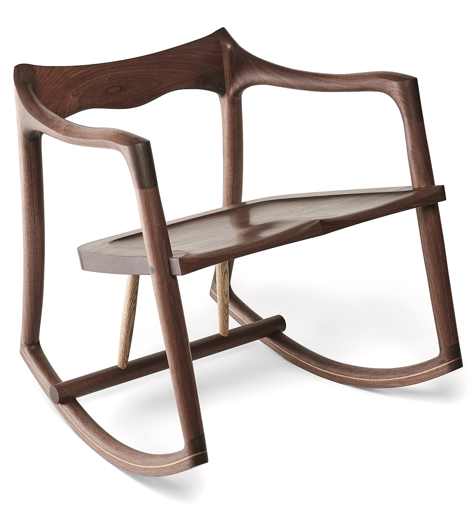 After a decade in New York City constructing high-end cabinets and furniture for clients, wood-worker Samuel Fisher returned to his native Alabama during the pandemic to start building the furniture he’d long dreamed of crafting. “I’d always wanted to make a workbench, a crib for my daughter, and a rocking chair,” Fisher says. “All three are very complex and have to be done exactly right, or they don’t work.” And although he has fond memories of being coaxed to sleep on the front porch of his great-grandmother’s farmhouse in rural Alabama, this is definitely not his great- grandmother’s rocker. He creates the contemporary low-back design’s frame and seat to order from blocks of gleaming Eastern black walnut. The seat supports featuring locally harvested white oak—a touch of Alabama oak in every piece is a Fisher signature—help complete the floating illusion. “It feels like you’re swinging through the air,” he says of the sleek, Sam Maloof–inspired silhouette, which he polishes by hand for a silky- smooth finish and sheen.