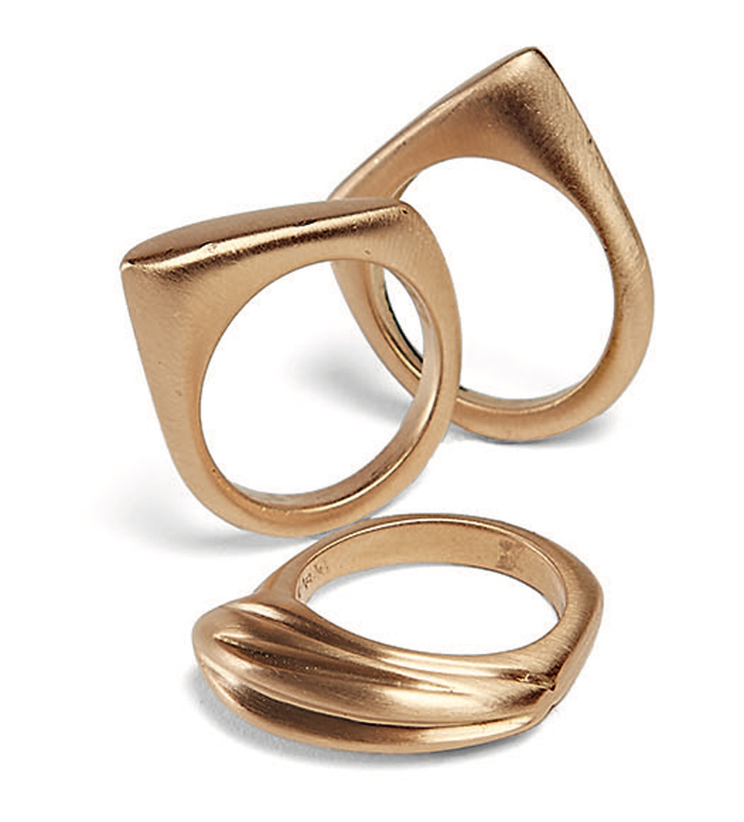 The inspiration for Sarah Muse’s Honey Drip jewelry collection came to the Virginia artist, designer, and goldsmith in a vision—literally. During her daily meditation practice, the bright golden drip, which she says represents heightened perception or the opening of one’s third eye, appeared. “It just called to me,” Muse says. “I had to act on it. I went to the studio and started carving and I couldn’t stop.” The ethereal capsule collection includes four elegant ring designs plus two pendants, and she plans to add a matching bracelet and earrings. Inside her studio, tucked into the Blue Ridge Mountains in Roanoke, Muse hand carves each Honey Drip ring from wax before sending the molds to a casting company, which casts them in solid eighteen-karat gold and then returns them to her for a final polish and brush finish. The statement rings are substantial enough to be worn on their own, but Muse loves how their asymmetry allows a wearer to artfully stack them together.